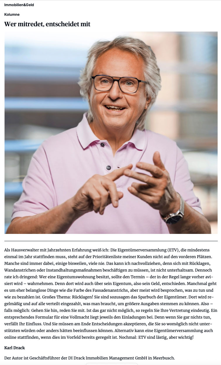 In den langen Jahren seiner Zeit als Inhaber einer Hausverwaltung in Düsseldorf und den vier Jahren auf Sylt hat sich Drack ein Team von Fachleuten zusammengestellt, das sämtliche Fragen rund um Immobilien beantworten, Probleme lösen kann. Er weiß, wie unterschiedlich die Bedürfnisse sind – den Eigner einer Immobilie auf Sylt bewegen andere Fragen als die Eigentümergemeinschaft einer ETW-Anlage in Düsseldorf. DI kümmert sich daher exklusiv um die Kundschaft, die privat genutzte Objekte auf Sylt oder in Düsseldorf besitzt. Ihnen werden maßgeschneiderte Konzepte angeboten, die exakt dem entsprechen, was die Kunden brauchen und sich wünschen.